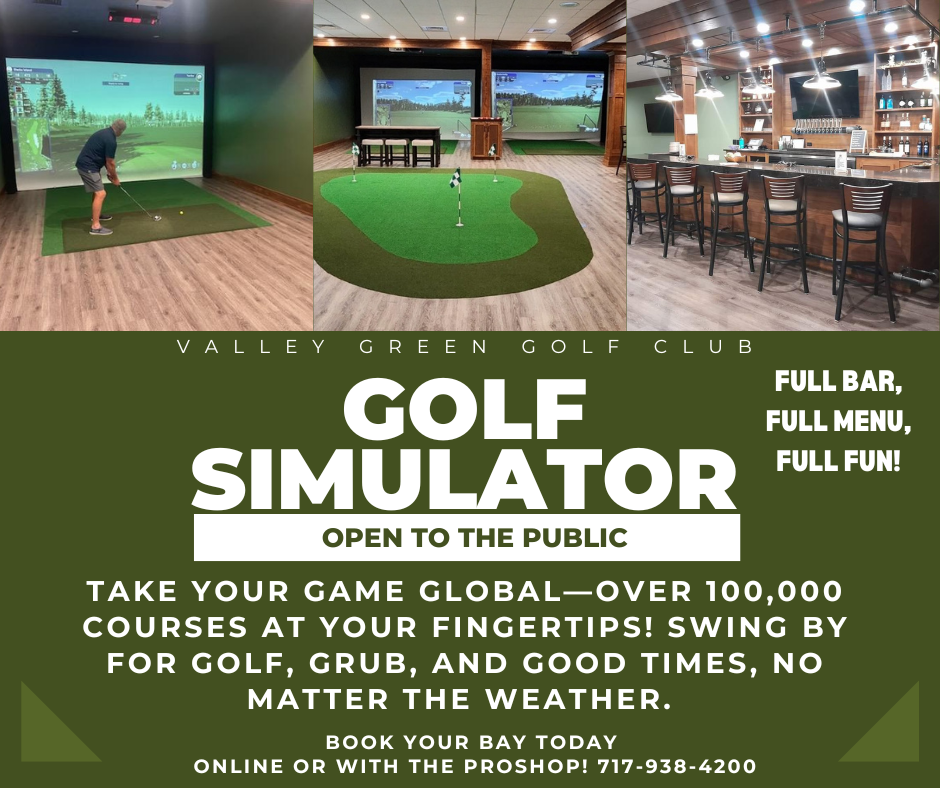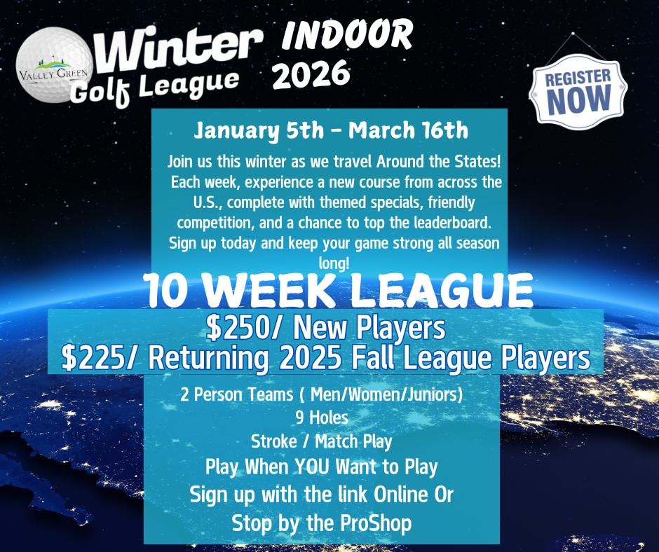 Join Valley Green Golf Club’s 2026 Winter Indoor Golf League! Keep your swing sharp all winter long in our state-of-the-art Irons & Ale Golf Simulator Lounge. Our Winter Golf League offers flexible play times, weekly food & drink specials, and a fun, competitive atmosphere for golfers of all skill levels. Play when it works for you, enjoy warm indoor comfort, and take advantage of our top-tier simulators. Register online today to secure your spot in Valley Green’s most popular indoor league of the year! Click Flyer to Sign Up or for More Details!